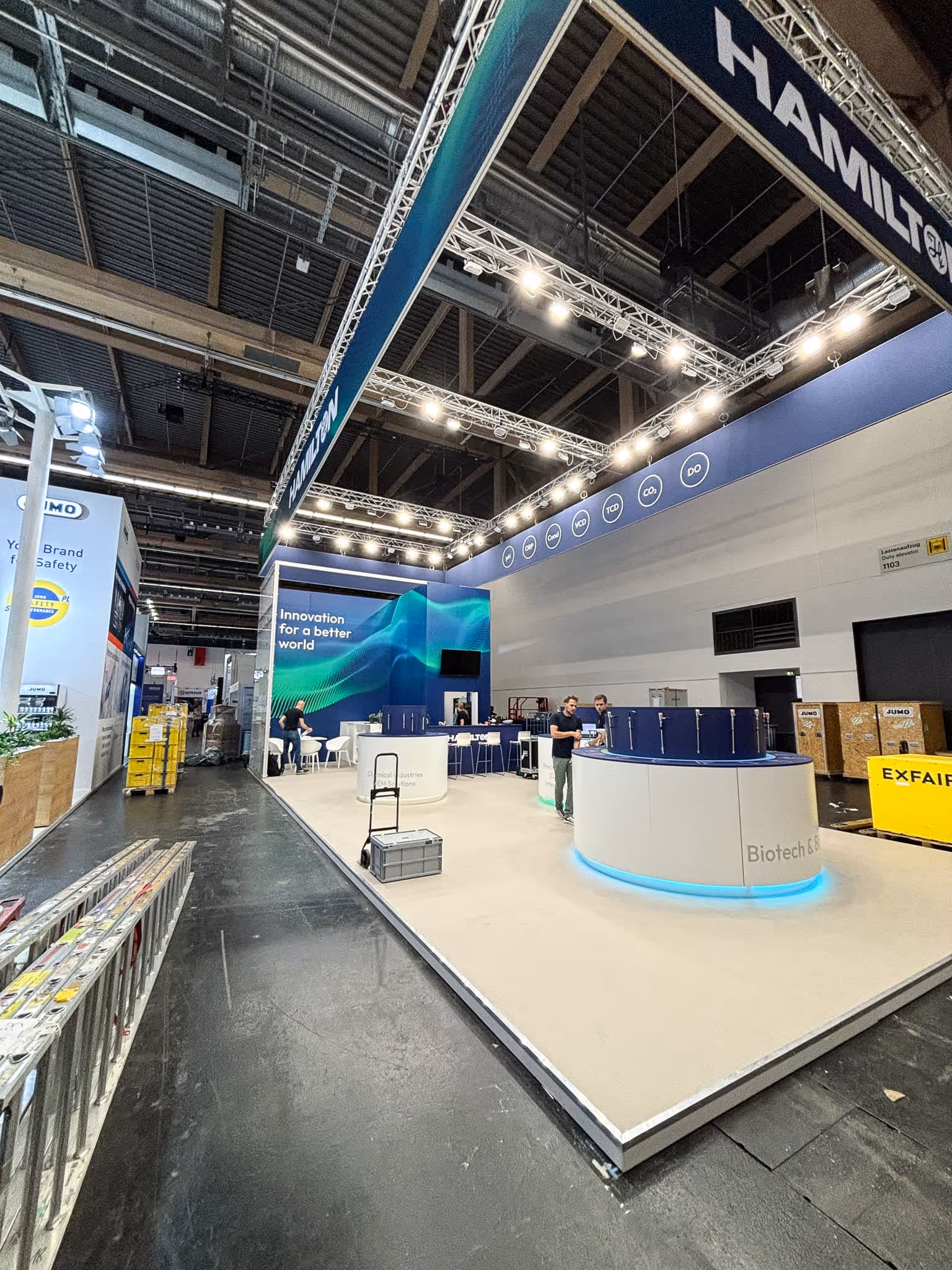 Der Systemstand mit 5 m Höhe kombinierte bedruckte Aluverbundplatten mit einer eindrucksvollen Acrylglas-Wall, die für transparente Akzente und eine hochwertige Anmutung sorgte. Im Zentrum des Standes: Individuell gefertigte, runde Produktpräsentations-Korpusse, die die Hightech-Sensorlösungen von HAMILTON elegant in Szene setzten.